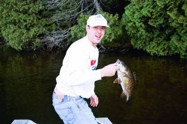 This lake is a paradox. Incerdibly beautifull with pure spring fed water bubbling up from the depths of the Canadian shield surronded by the rough wilderness of west Quebec. The lake features some of the best Small mouth Bass fishing I've ever seen. However as with everything in life the good comes with the bad. The lake is close to the city so some landowners in the region are apt to bring lawnmowers tractors power tools and city like determination to turn the wilderness into the suburbs. Fortunately Mother nature has made some effective roadblocks, a wicked geography of steep rock hill, a water table that bubbles up to the surface, vicious blackfly's and mosquito's. Never the less if you can fight your way past all the bad your left with the good. This was the case for Megastir and the angler formerly known as Cowboy in early May undetered by the bugs the two anglers fortified with the necessery supplies headed onto the lake in search of Bass. They were not dissapointed. Megastir hit first fighting a angry smallmouth into the boat using a trust Red Devil.
