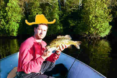 The Angler formerly known as Cowboy (TAFKAC), using his finely honed but mysterious techniques was able to soon hit onto an even bigger Smallie using some sort of floating lure that he claimed drew the fish from deep under water and created such a disturbing site that the poor beasts were forced to attack the bait with a savage fury reserved only for their most hated enemies of the deep. None the less the results speak for themselves as (TAFKAC) fought this one into camera range.